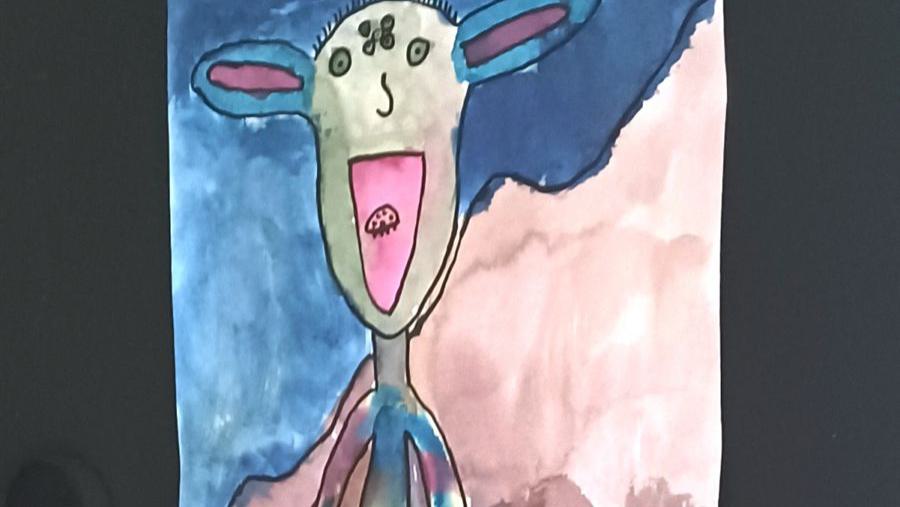 Grundlage der Arbeit von Milena Mathiebes (5a) "Lustiger Lulatsch" war ein Cadavre Exquis von drei weiteren Mitspielern ihrer Klasse. Das ist ein Spiel, bei dem das Papier in Abschnitte gefaltet wird und jeder Mitspieler einen Teil ausfüllt, ohne die Arbeit seines Vorgängers zu kennen. So entstand diese lustige Figur, die mit einem Haustier vervollständigt und farbig lasierend gestaltet wurde. Betrachtet man den Lulatsch, bekommt man gute Laune und möchte ihn am liebsten auf seinem Weg begleiten.