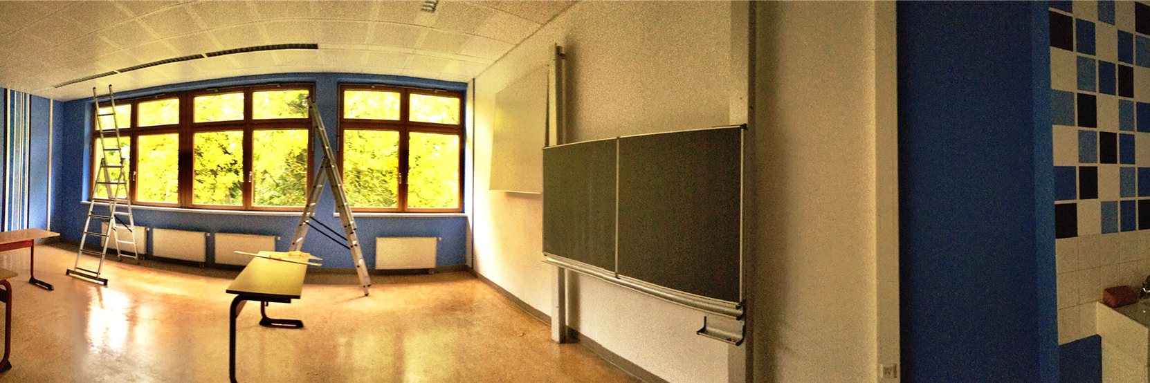 Nach den Herbstferien war die Verwunderung bei vielen Schülern und Lehrern groß. Die B39 hatte sich in den Ferien zu einem freundlichen, einladenden Raum verwandelt. Doch nicht die Heinzelmännchen waren am Werk, sondern die Klasse 8b. Die Schüler fingen am letzten Schultag direkt nach dem Unterricht an, den Raum auszuräumen und Fenster, Steckdosen sowie Tafeln abzukleben. Sogar einige schmutzige Deckenplatten wurden herausgenommen, um sie neu zu streichen. An zwei weiteren Ferientagen traf sich eine Schülergruppe zum Streichen der Wände und anschließenden Detailgestaltung, wie ein Karomuster über der Waschecke und Wandstreifen zwischen den Blautönen. Natürlich lief nicht alles glatt – mal war die Leiter zu kurz, die Farbe deckte nicht beim ersten Mal und Malerkrepp hielt nicht. Aber die Schüler ließen sich nicht beirren und zogen ihren Traum vom neuen Klassenzimmer durch.