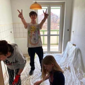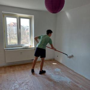 Siebzehn Schüler strichen und putzten einige der elf Wohnungen, die Menschen aus der Ukraine zur Verfügung gestellt werden sollen. Unterstützt wurden sie von unserer ehemaligen Schülerin Elisabeth Schreiber, von fünf jungen Leuten, die der Jugendbeirat organisiert hatte – und natürlich auch von Herrn Richter, Frau Heisler und Frau Venediger. Ihr habt viel geschafft und ganz praktisch geholfen. Vielen Dank, dass Ihr einen Teil eures Samstags geopfert habt, um zu helfen!
