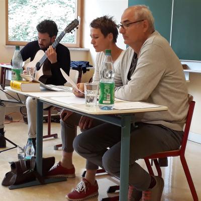 Die Schauspieler lasen, immer wieder untermalt von einem kolumbianischen Gitarristen, in sehr einfühlsamer Art und auch szenisch die unterschiedlichen Texte, sodass für die Schüler die physische aber vor allem auch seelische Bedrängnis der Autoren deutlich wurde.