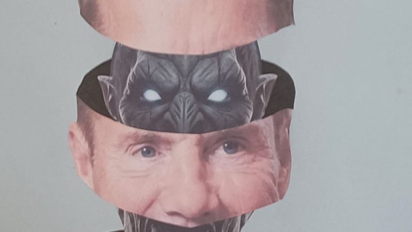 In Klasse 9 befassten sich die Schüler zum Thema "Zufallstechniken" mit der Collage. Bei dieser Technik werden verschiedene Bildteile wieder zu einem neuen Ganzen zusammengefügt. Auf schaurige Weise kann man den Effekt bei Lennox Jähnes (9e) Porträtcollage "Hinter der Pop-Titan-Fassade" beobachten: Aus dem Inneren von Dieter Bohlens feinsäuberlich in Scheiben zerschnittenem Gesicht blinzelt ein dunkles Monster hervor. Die mit Filzstift gesetzten Schattierungen verstärken den räumlichen Effekt.