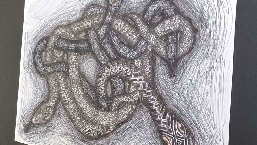 Eine über der anderen winden sich gelbäugige Schlangen und stechen sich bedrohlich aus dunklem Hintergrund hervor. Jede hat eine andere Haut und wirkt zum Greifen nah. Lara Diers (7e) ist mit dieser "Schlangengrube" eine schaurig-schöne Zeichnung gelungen. Dabei hat sie Schraffuren hervorragend eingesetzt, um Spannung und Räumlichkeit zu erzeugen.