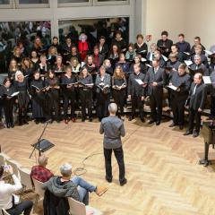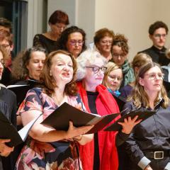 Getragen von einer schon in den ersten Begegnungen am Nachmittag mit Händen zu greifenden Vorfreude wuchs innerhalb von wenigen Minuten eine Gruppe von 55 Ehemaligen aus Abschlussjahrgängen von 1981 bis 2022 zu einer Gemeinschaft zusammen, die beseelt war von dem Ziel, sich und dem Publikum einen besonderen Abend zu schenken. Der so oft beschworene und schon verschollen geglaubte Geist der RHS muss wohlgefällig über diesem Tag geschwebt sein. Oder war es vielleicht doch die gediegene Ausbildung in der musikalischen Vertiefung über mittlerweile fast fünf Jahrzehnte, die so nachhaltig gewirkt und die Mitwirkenden so geprägt hat, dass sich ein besonderes Hochgefühl und eine innere Disziplin einstellten, die es ermöglichten, dieses anspruchsvolle Programm in kürzester Zeit nicht nur künstlerisch, sondern auch im reibungslosen Ablauf zu realisieren.