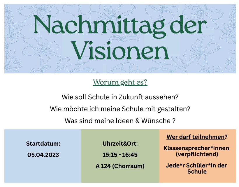 Lass dich bei Interesse von deinem Klassensprecher in eine der Gruppe eintragen oder trag dich selbst in den Aushang am Sekretariat ein.