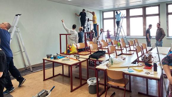 Am Freitag, den 17.11.2023, war es dann endlich soweit. Nach Schulschluss ging es „bewaffnet“ mit Spachtel, Malerkrepp und Abdeckfolie los, die Vorbereitungsarbeiten zu machen. Wir trafen uns mit Frau Graupner und werkelten los. So wurden alte Tafeln entfernt, Löcher zugespachtelt und abgeklebt. Der Grundanstrich in einem pastellfarbenen Grünton war am Abend schon an den Wänden.