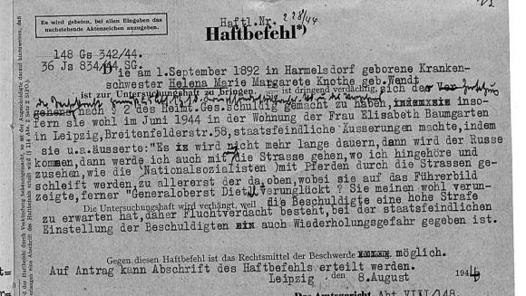 Von einer ihrer Patientinnen, Elisabeth Baumgarten und deren Freundin Isle Müller, wurde Helene Knothe im Juli 1944 denunziert. Unter anderem soll sie sich negativ über Adolf Hitler geäußert und den bevorstehenden Umsturz angekündigt haben. Der Haftbefehl erging nach verschiedenen Verhören am 08. August 1944 durch das Amtsgericht Leipzig. In der Haft in Leipzig wurden politische Überprüfungen vorgenommen, Zeugen gehört und ein psychologisches Gutachten erstellt. Das Verfahren wurde mit äußerstem Tempo weiter vorangetrieben, allerdings wird äußerlich der Schein eines rechtsstaatlichen Vorgehens bewahrt. Helene Knothe bestritt wesentliche Anschuldigungen, andere gab sie zu. Sie verwies dabei auf ihr loses Mundwerk. In einem Verhör gab sie zu Protokoll, aufgrund der vielen Luftangriffe und Belastungen durch die Nachdienste mit den Nerven am Ende gewesen zu sein, deshalb sei es ihr auch nicht recht, dass sich Deutschland im Kriege befinde.