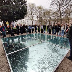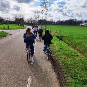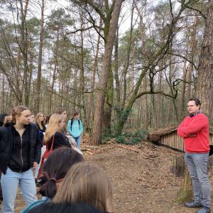 Nach einer mehr oder weniger kurzen Nacht ging es Dienstag früh an die Arbeit. Die Schüler haben die Aufgabe, Erinnerungsorte des 2. Weltkrieges in und um Epe zu einer Tour zusammenzustellen. Nach der Recherche in der Schule wurden die ersten Orte, beispielsweise Stolpersteine in Epe, aufgesucht. Am Nachmittag folgte eine gemeinsame Radtour zum „Verschollenen Dorf“. An diesem Ort versteckten sich rund 80 Personen in den Jahren 1943/44 vor dem Nazi-Regime in den Wäldern um Epe.