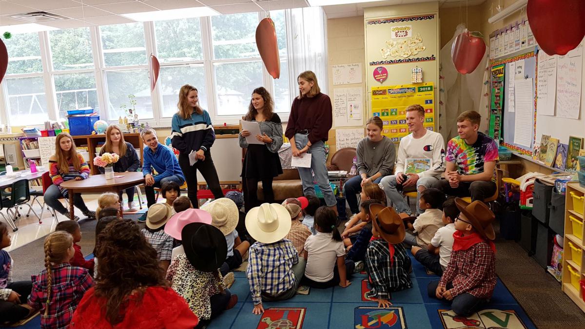 Heute verließen wir die Schule nach der fünften Stunde, um zur St. Mark Elementary School zu fahren. Dort trafen wir auf sehr aufgeregte Kinder, denen wir die ersten Wörter auf Deutsch beibrachten. Mit Begeisterung haben sie mit uns zusammen gesungen und spielerisch die Namen der Farben gelernt. Zum Abschluss gab es für die Kinder und Lehrer Süßigkeiten und Sticker.