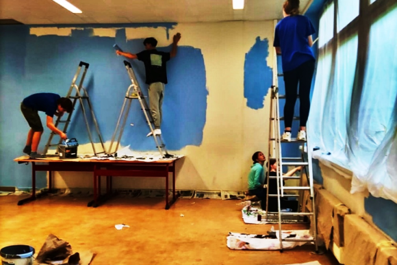 Nach den Herbstferien war die Verwunderung bei vielen Schülern und Lehrern groß. Die B39 hatte sich in den Ferien zu einem freundlichen, einladenden Raum verwandelt. Doch nicht die Heinzelmännchen waren am Werk, sondern die Klasse 8b. Die Schüler fingen am letzten Schultag direkt nach dem Unterricht an, den Raum auszuräumen und Fenster, Steckdosen sowie Tafeln abzukleben. Sogar einige schmutzige Deckenplatten wurden herausgenommen, um sie neu zu streichen. An zwei weiteren Ferientagen traf sich eine Schülergruppe zum Streichen der Wände und anschließenden Detailgestaltung, wie ein Karomuster über der Waschecke und Wandstreifen zwischen den Blautönen. Natürlich lief nicht alles glatt – mal war die Leiter zu kurz, die Farbe deckte nicht beim ersten Mal und Malerkrepp hielt nicht. Aber die Schüler ließen sich nicht beirren und zogen ihren Traum vom neuen Klassenzimmer durch.