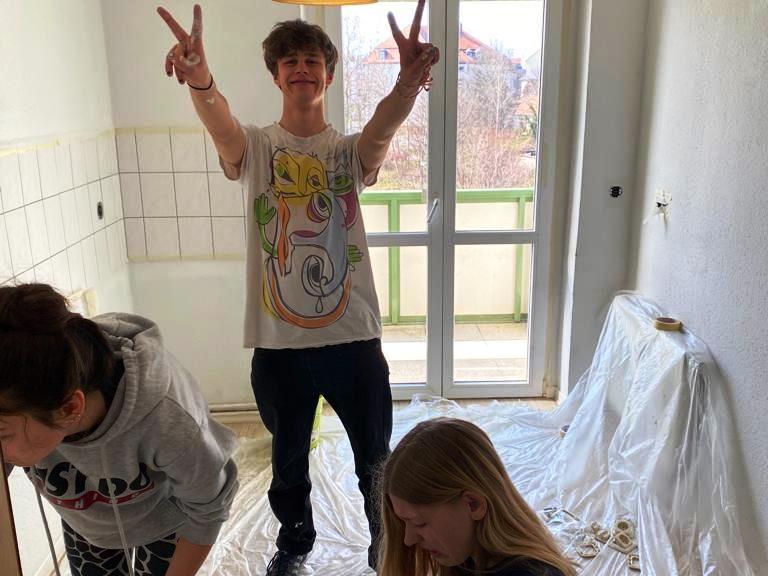 Siebzehn Schüler strichen und putzten einige der elf Wohnungen, die Menschen aus der Ukraine zur Verfügung gestellt werden sollen. Unterstützt wurden sie von unserer ehemaligen Schülerin Elisabeth Schreiber, von fünf jungen Leuten, die der Jugendbeirat organisiert hatte – und natürlich auch von Herrn Richter, Frau Heisler und Frau Venediger. Ihr habt viel geschafft und ganz praktisch geholfen. Vielen Dank, dass Ihr einen Teil eures Samstags geopfert habt, um zu helfen!