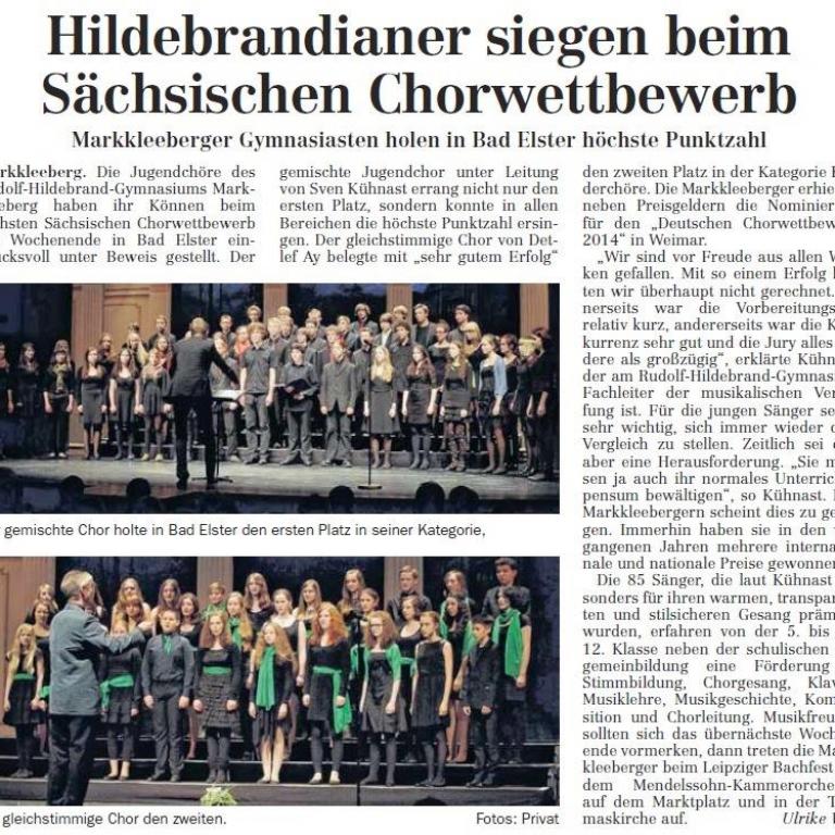 Unsere Chöre räumen beim Sächsischen Chorwettbewerb in Bad Elster so richtig ab: Der gemischte Chor unter Leitung von Sven Kühnast erringt den ersten Platz, der gleichstimmige Chor unter Detlef Ay den zweiten Platz in der Kategorie Kinderchöre. Neben einem Preisgeld lockt die Teilnahme am "Deutschen Chorwettbewerb 2014" in Weimar.