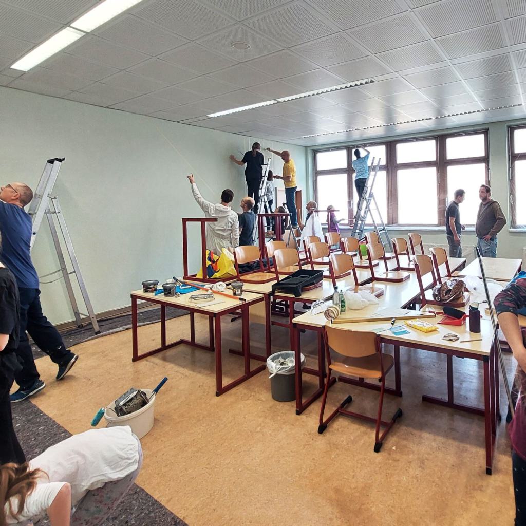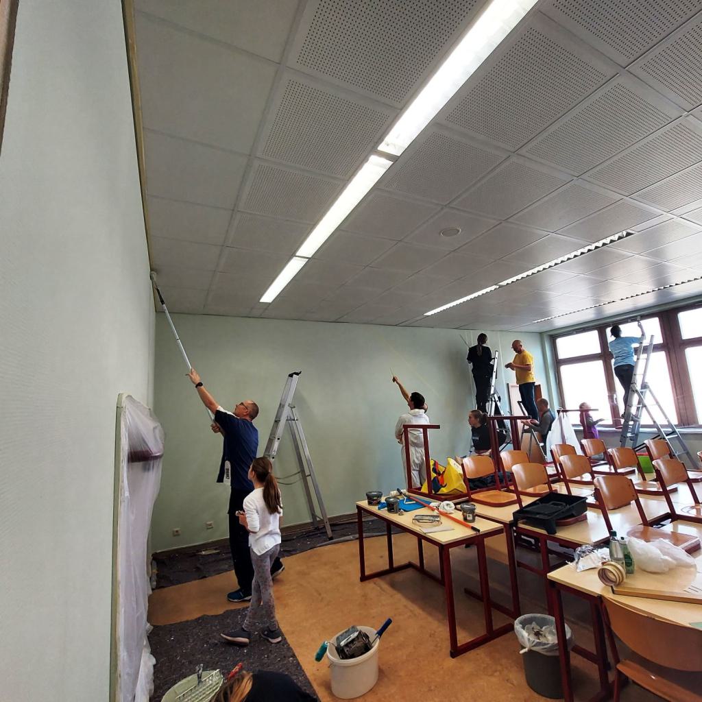 Am Freitag, den 17.11.2023, war es dann endlich soweit. Nach Schulschluss ging es „bewaffnet“ mit Spachtel, Malerkrepp und Abdeckfolie los, die Vorbereitungsarbeiten zu machen. Wir trafen uns mit Frau Graupner und werkelten los. So wurden alte Tafeln entfernt, Löcher zugespachtelt und abgeklebt. Der Grundanstrich in einem pastellfarbenen Grünton war am Abend schon an den Wänden.