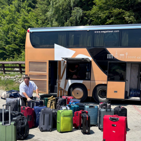 Noch im Morgengrauen sammelten wir uns, müde, aber voller Vorfreude, am Bus. Koffer wurden verladen, Plätze ausgesucht, und schon bald rollten wir los – ein ganzer Tag auf Rädern in Richtung Rumänien lag vor uns. Die Stunden verflogen mit Kartenspielen, Musik über Kopfhörer und herzhaftem Lachen. Einige versanken in Schlaf, andere führten Gespräche oder schauten aus dem Fenster, wo sich Landschaften langsam veränderten. In besonderen Punkten unserer länderdurchquerenden Busfahrt gab Herr Dinter uns spannende Fakten und die philosophische Frage „Wo beginnt der Osten“ auf den Weg, welche uns auf der gesamten Reise begleitete. Da wir die Nacht im Bus verbrachten, gab es keine wirkliche Abendroutine – Zähne wurden auf Rastplätzen geputzt und geschlafen wurde irgendwo zwischen Nackenstütze und Rucksack. Kurz nach Mitternacht haben wir dann noch in Jonathans Geburtstag reingefeiert. Natürlich wurde auch gesungen… Trotz der Länge der Fahrt lag eine gespannte, positive Aufregung in der Luft – das war der Anfang einer Reise, die wir so schnell nicht vergessen würden.