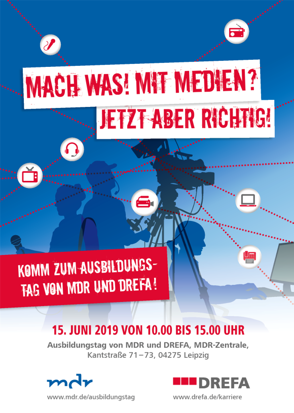 „Was mit Medien machen“, das wollen viele junge Berufseinsteiger. Denn die Medienbranche ist interessant, abwechslungsreich, spannend und kreativ. Darum sind auch kaufmännische und technische Berufe in der Medienbranche begehrt. Der Mitteldeutsche Rundfunk (MDR) und die DREFA-Mediengruppe (DREFA) bilden in sieben attraktiven Berufsfeldern jedes Jahr medienbegeisterte Menschen aus.